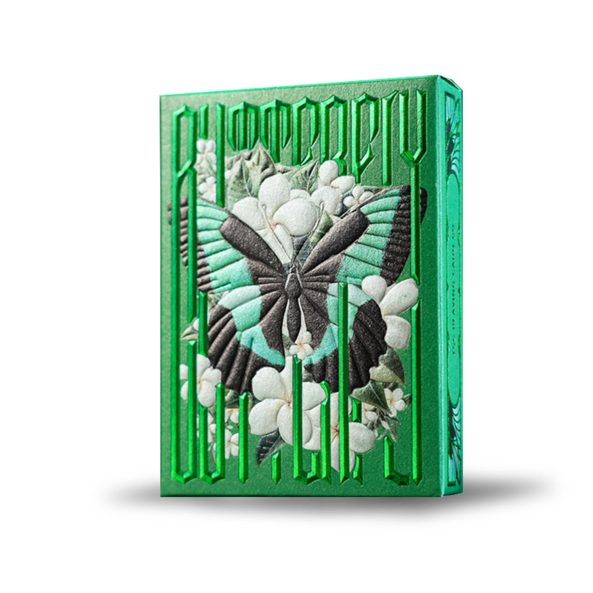 On the card backs, cold foil is applied with precision, so that within the vein-divided sections of the butterfly’s wings, a subtle pale-green sheen shimmers through, creating a vivid and luminous effect.
