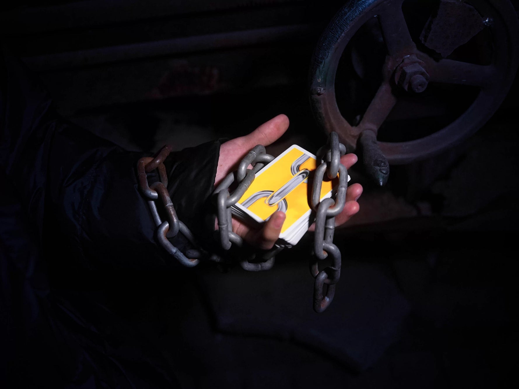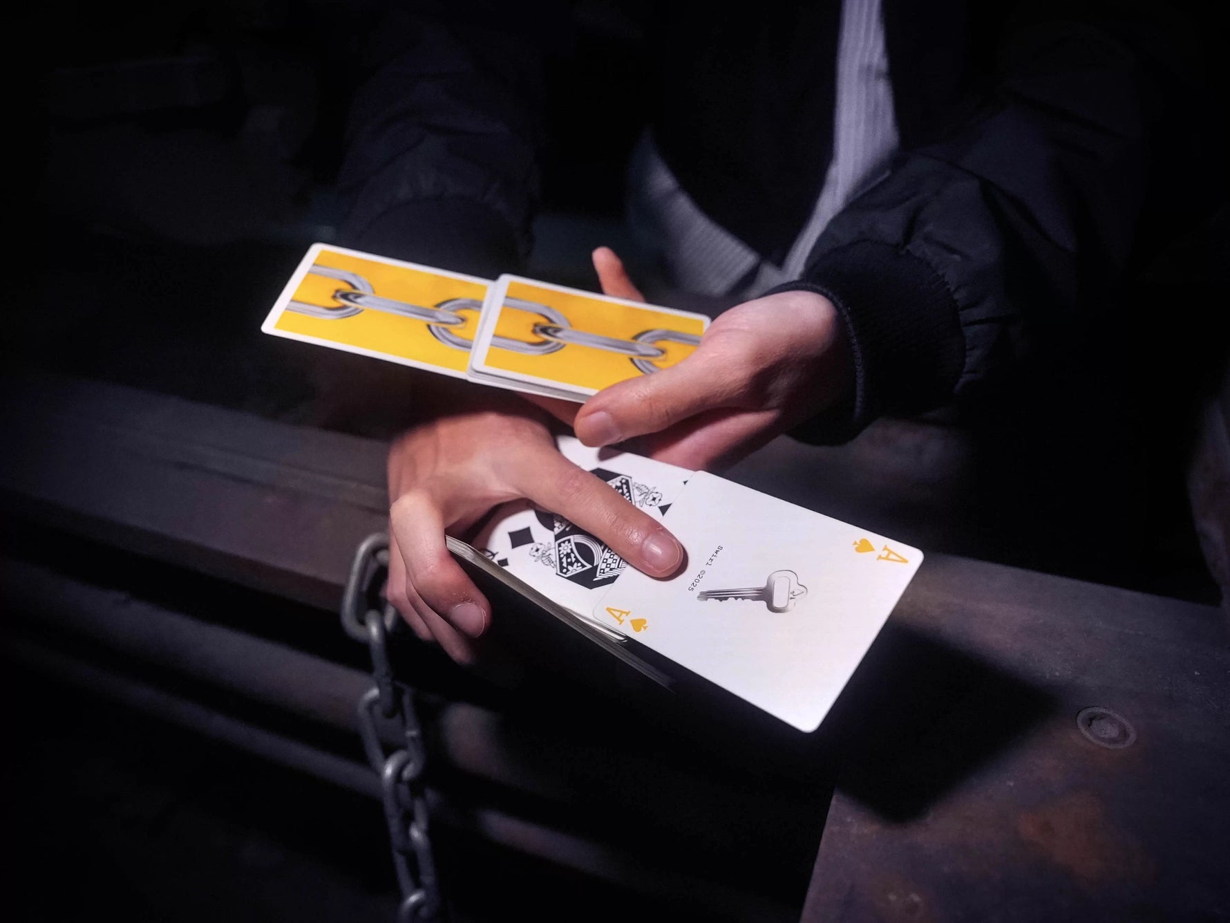 Aligned along the short edge, card backs form a continuous chain on a yellow, wall-like background.