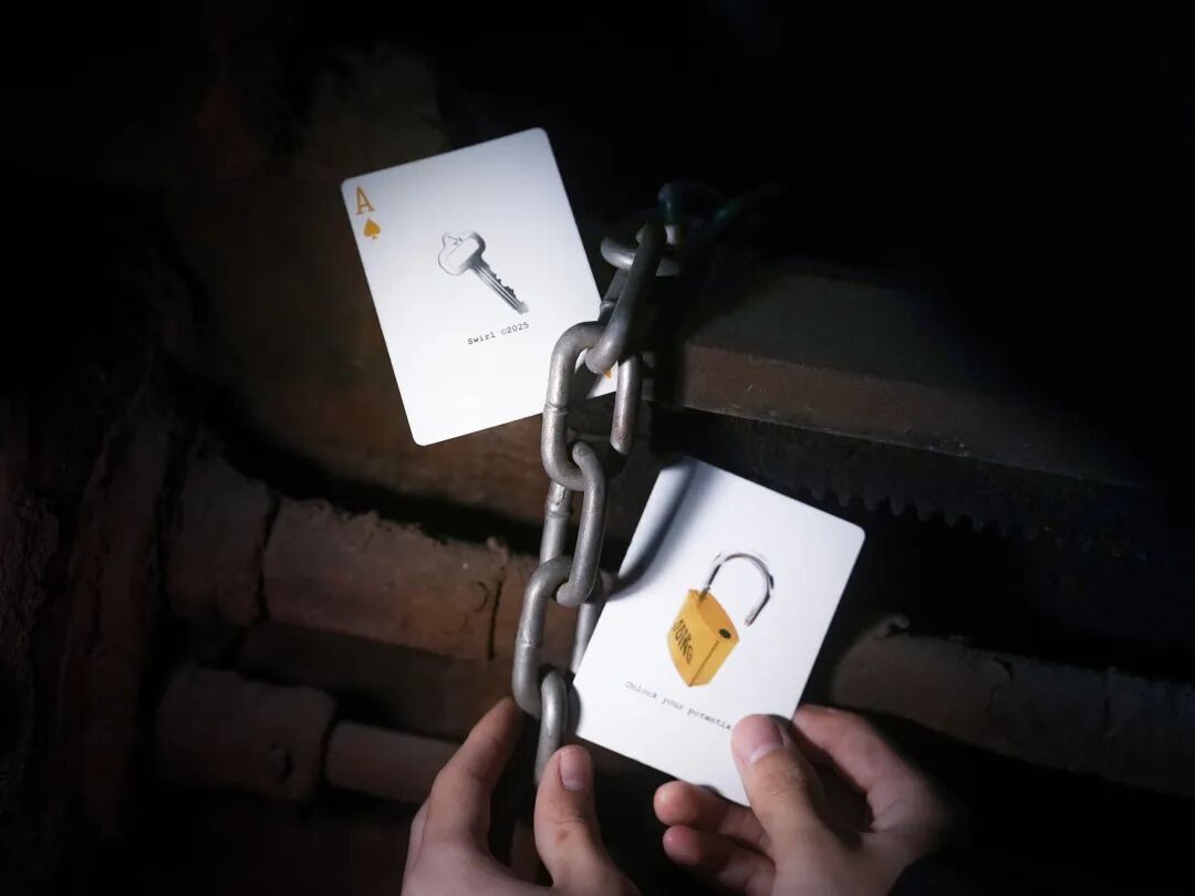 Faces use a simple yellow-and-black palette. The Ace of Spades merges key and keyhole, while a special card shows a lock engraved with “Keep Going” and “Unlock your potential,” symbolizing breaking free and unleashing potential.