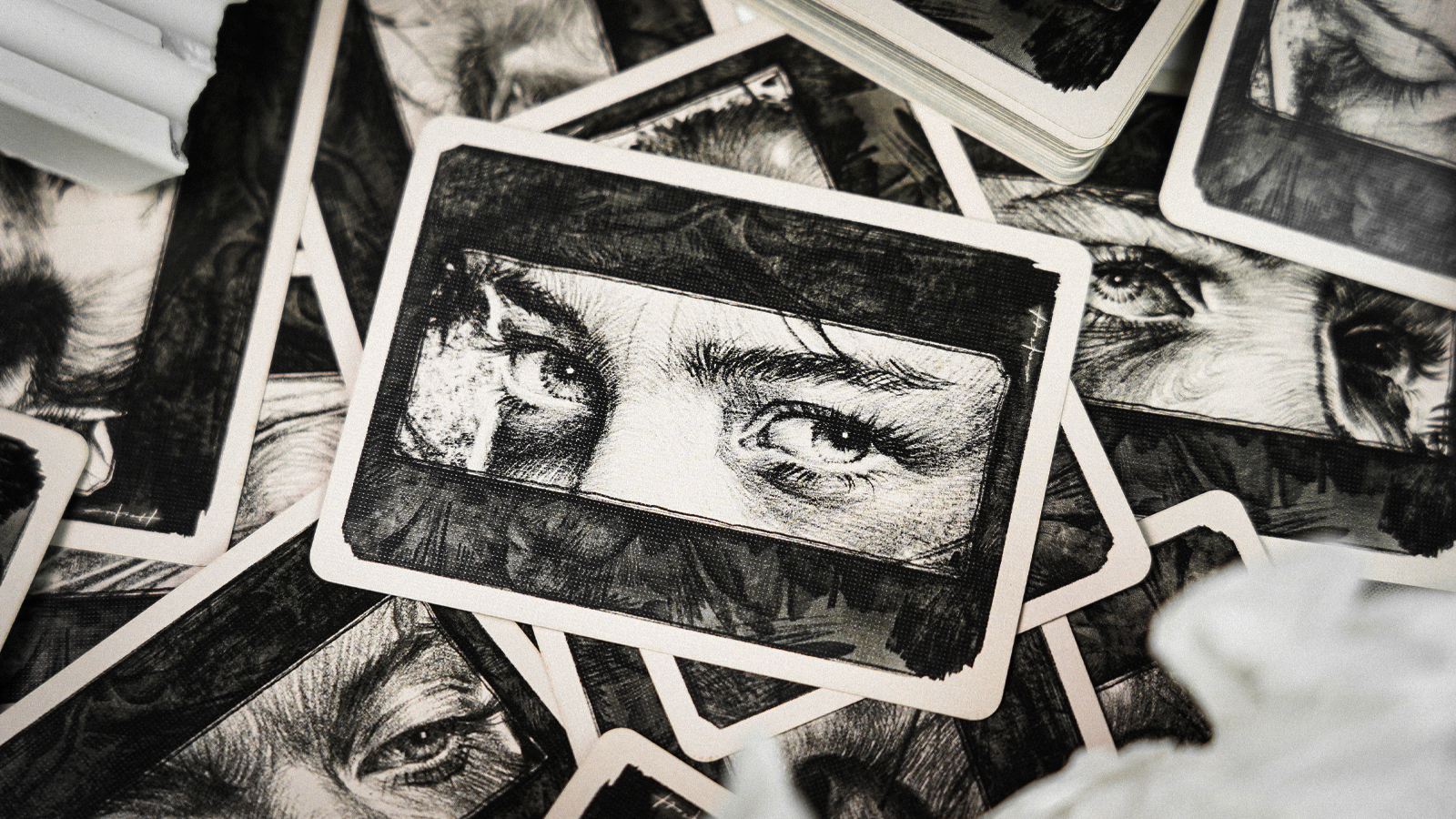 The backs cleverly incorporate the eyes of character portraits as illustration elements, with 54 unique illustrations ensuring that each card back is one of a kind.