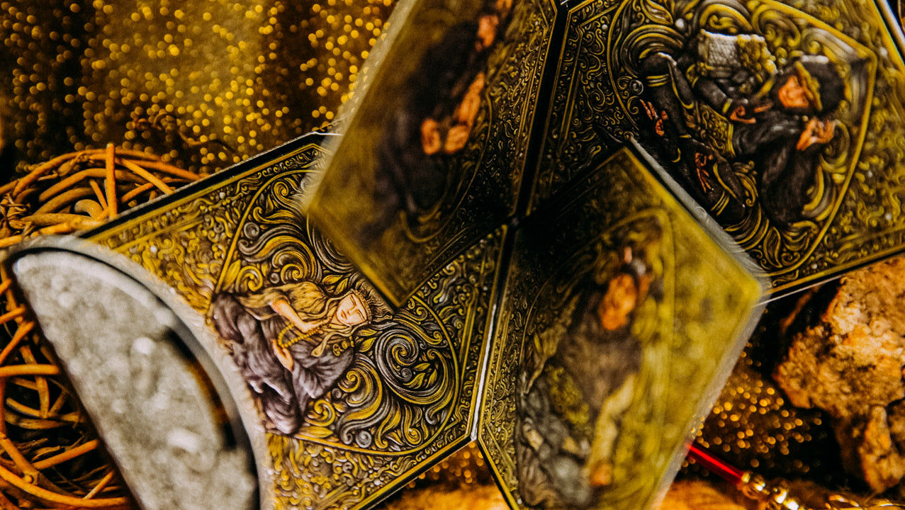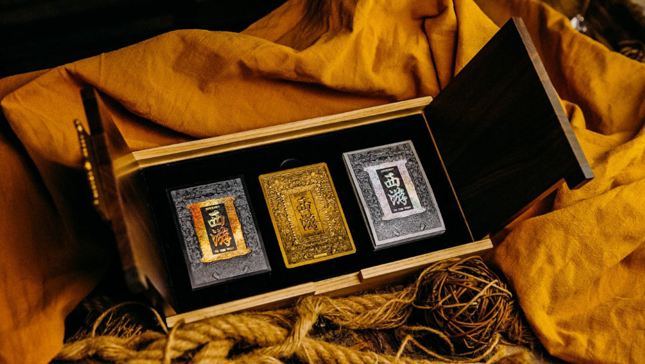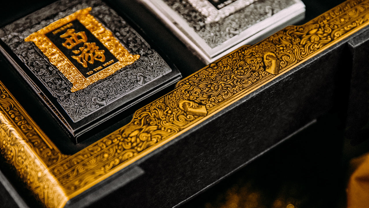 A collector's gift box that matches the playing cards, with a rare plaque in the center shining with a metallic luster, perfectly complementing the large expanse of high-quality textured paper