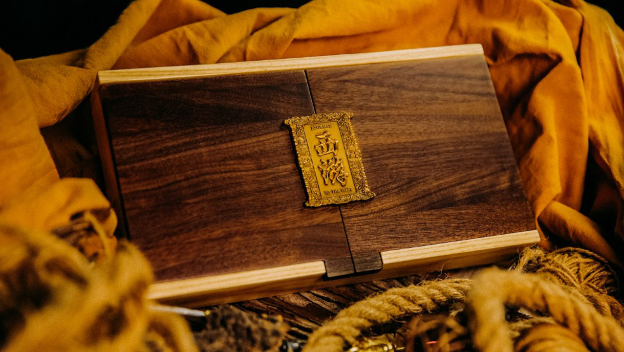 The luxury wooden box is designed with double doors, and a Journey to the West brand is embedded in the center seam. The natural wood grain on the brand and the wooden box makes it a true work of art.