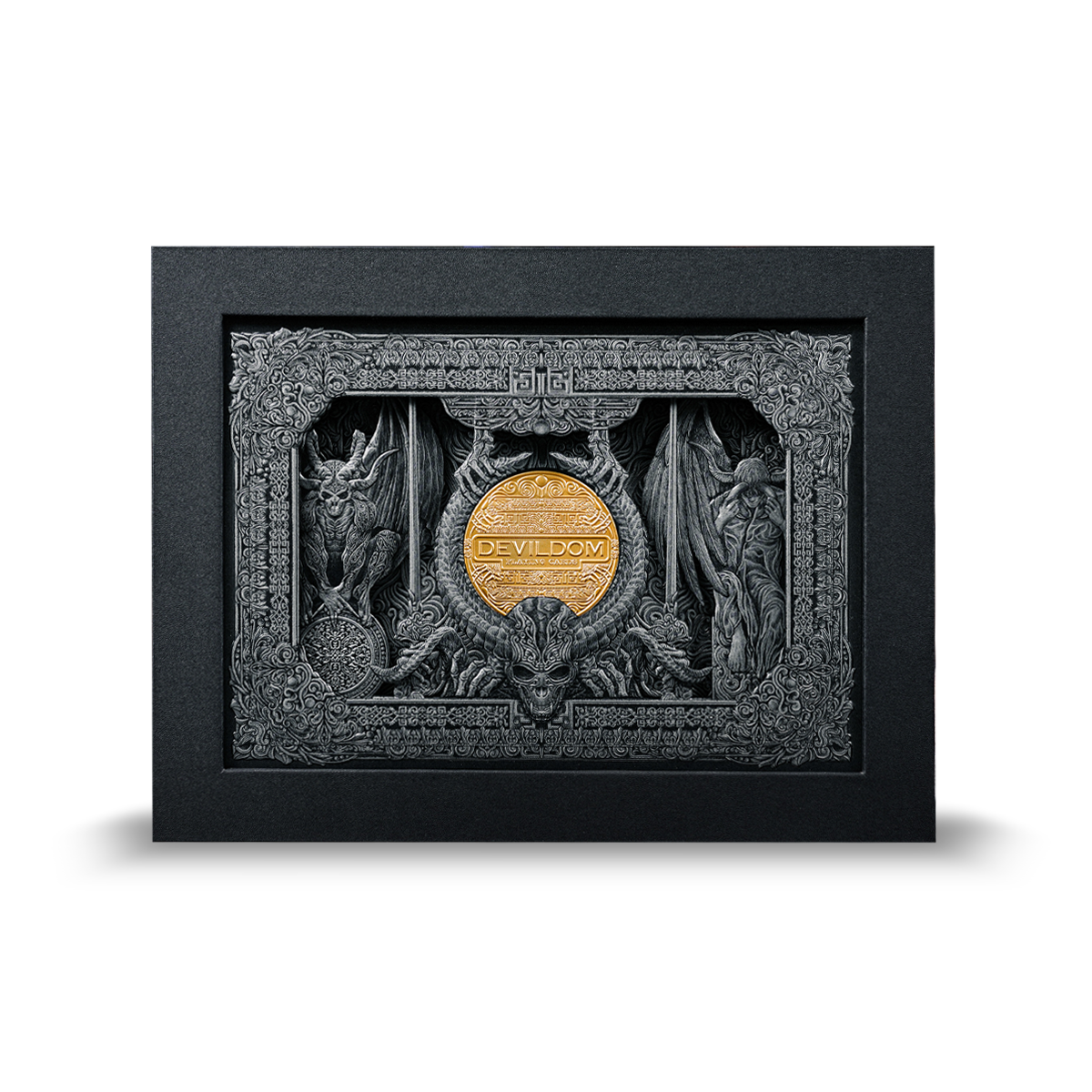 This is a luxurious and exquisite high-end playing card gift box set specifically designed for a demon-themed poker deck. The gift box features black and dark silver as the main color scheme, creating a mysterious and noble texture. The front showcases a multi-layer embossed artwork composed of four layers, each utilizing full-panel embossing and hot foil stamping techniques, resulting in a visually stunning and three-dimensional image.