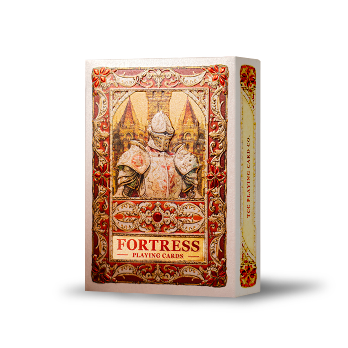 We present a classic, elegant design with embossed knights and castles on the tuck case, adorned with red foil extending to the interior. The suit designs, inspired by heraldry and embellished with gemstones, reflect the grandeur of royalty.