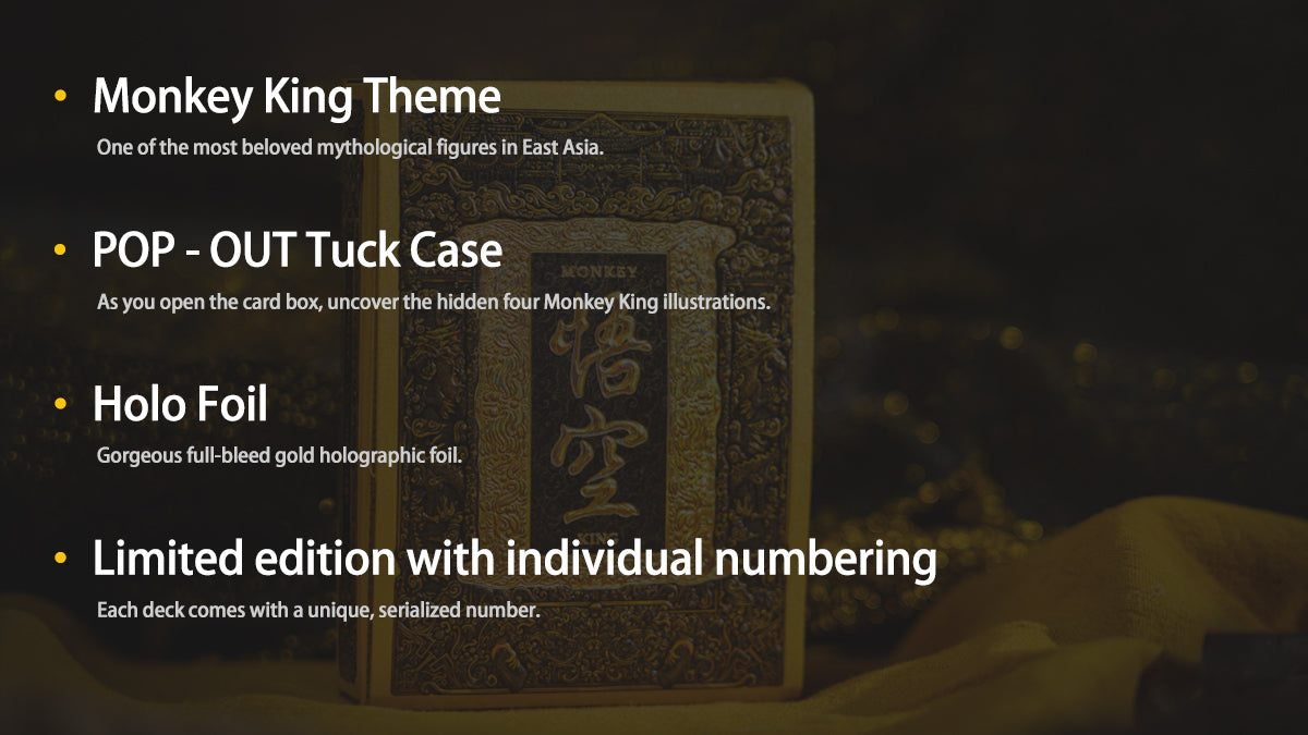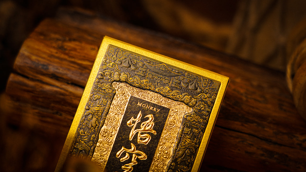 The craftsmanship and design of these cards are laden with intricate details, in the center of each card tuck case is an elegant plaque, bearing the inscription "Monkey king 悟空."